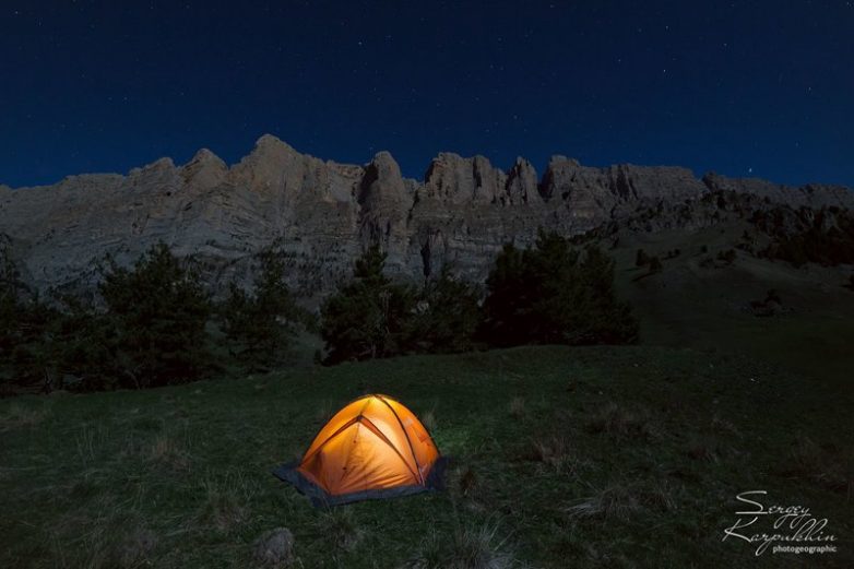 А вот и палатка в ночном кадре на фоне Скалистого хребта.