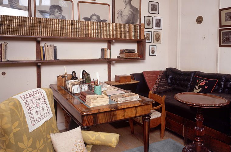 Еще одна ценная деталь интерьера дома Толстых — темный, обитый клеенкой диван. На нем родился сам Толстой, его братья, сестра и 11 детей. Где бы ни находился диван, перед родами Софьи Андреевны его всегда переносили в ее комнату. Похожая ситуация происходит и в романе «Война и мир» — в сцене родов маленькой княгини Лизы Болконской. «Через пять минут княжна (Марья. — Прим. ред.) из своей комнаты услыхала, что несут что-то тяжелое. Она выглянула — официанты несли для чего-то в спальню кожаный диван, стоявший в кабинете князя Андрея. На лицах несших людей было что-то торжественное и тихое».
