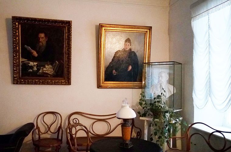 Уже в то время, когда в Ясной Поляне жил Толстой, в гостиной на втором этаже висели картины. Их чудом удалось сохранить до наших дней: во время Великой Отечественной войны более 40 000 вещей из усадьбы удалось эвакуировать. На самой крайней справа картине рядом с бюстом Толстого изображена его жена Софья Андреевна: на портрете женщина кажется спокойной и вальяжной. Но именно этот образ противоречил натуре супруги Льва Николаевича, которая была энергичной и деятельной женщиной. Софья Андреевна прозвала портрет «ленивым изображением».