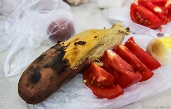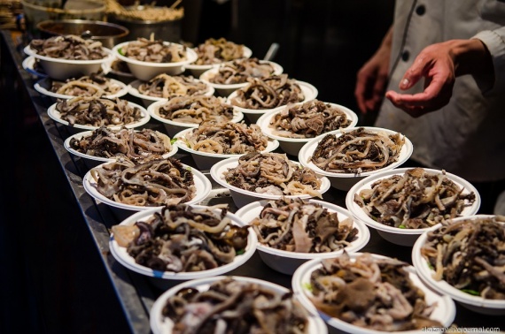 Морепродукты готовят из живых ингридиентов. Взвесили креветок, вам их сразу отварили. Большинство морских гадов выкладывают на улице в пластмассовых тарах, наполненных водой с подающимся в нее кислородом. Без еды в Китае вы не останетесь, это совершенно точно, везде есть как элитные рестораны, так и микрозабегаловки, в которых кормят отнюдь не хуже, а обслуживание, кстати, гораздо быстрее. Были моменты, когда что-то ели, но до конца не поняли что. Так, в Хуашане, купили вареную кукурузу и как нам показалось клубень зажаренного картофеля, а это оказался не картофель, а очень странный овощ. Жаль, что китаянка не смогла нам объяснить про него.