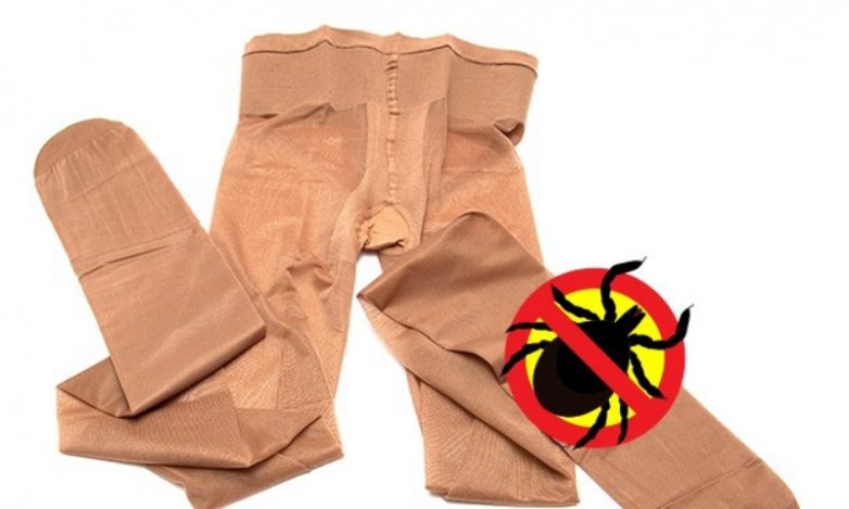 Прочные капроновые колготки прекрасно подойдут в качестве защиты от комаров и клещей. Из одной пары можно сделать что-то вроде майки с длинным рукавом (достаточно прорезать отверстие для головы), другую можно надеть на ноги.