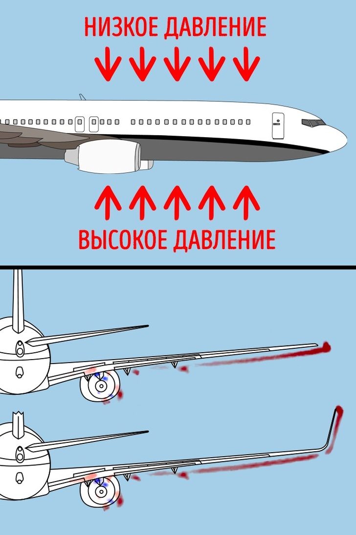 Во время полета давление снизу самолета выше, чем давление сверху. Поэтому воздух стремится к равновесию и пытается перейти из повышенной области в пониженную. А проще всего это сделать на крыльях самолета. Вот только достигая кончиков крыльев, воздух срывался и создавал сильную турбулентность.Тогда ученые загнули кончики крыльев вверх, убрав срыв воздушного потока. Это понизило турбулентность, повысило долговечность крыла и сэкономило немало топлива. То есть благодаря такой особенности нас не трясет во время всего полета.