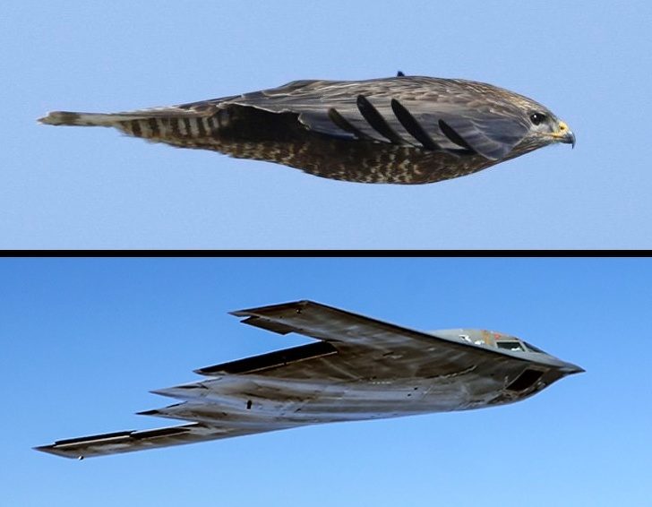 Вы, наверное, слышали про самолет, который еще называют невидимкой. Такой необычной формы он по одной простой причине: он летит как один цельный объект. Благодаря этому он быстрее, может перевозить большее количество багажа и расходует меньше топлива.Конструкция самолетов подсмотрена у птиц. Хищные птицы принимают подобную позу, чтобы увеличить дальность полета и быть менее заметными.