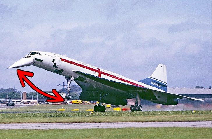 Нос военного истребителя острый. Чем острее форма, тем больше обтекаемость и тем быстрее самолет. Но из-за длинного носа плохо видно взлетную полосу, поэтому у обычных пассажирских самолетов носовая часть закругленная.Но британские инженеры решили эту проблему и в 1969 году сделали один из самых быстрых пассажирских самолетов, нос которого может менять наклон. Во время взлета и приземления нос опускается, а во время полета приводится в вертикальное положение.