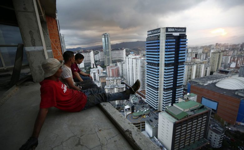Смотрите, эти мужчины отдыхают после трудной работы: они занимались утилизацией металлолома, украденного с небоскреба «Башня Давида». 45-этажное здание в центре Каракаса задумывалось как яркий финансовый центр. После смерти главного инвестора стройка перешла в разряд заброшенных. Мелкие банды и обычные голодранцы обдирают этот скелет уже второй десяток лет. Базируются ли здесь преступники? Еще как.