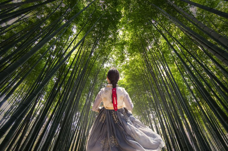 Девушка в корейском национальном платье в бамбуковом лесу