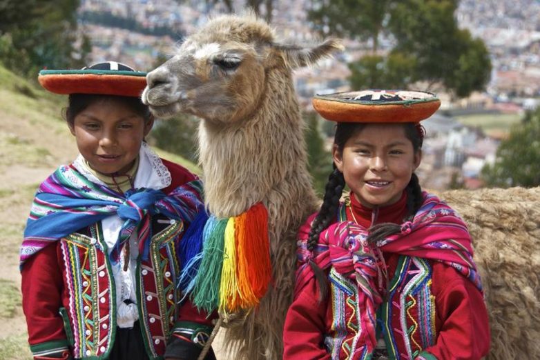 Боливийские дети с ламой — национальным символом Боливии