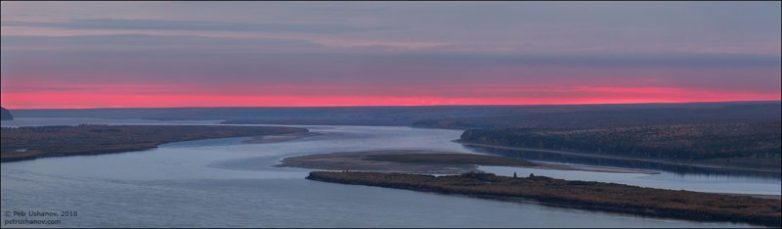 Первые двадцать километров на реке не было ничего интересного. Воды было мало, поэтому то мы ехали на катамаране, то катамаран на нас. Нашей задачей было дойти к вечеру до «ямы» — так называлось глубокое место на реке, после которого начинались столбы. Там мы первый раз подняли в воздух коптер, который специально везли на реку. Предыдущая панорама (за номером 3) как раз показывает это место. Видно, что вдали начинаются знаменитые столбы. А еще там ловилась рыба, и Ваня быстро поймал двух щук на ужин. Вечером посидели у костра, поболтали, выпили всякого, в том числе чаю… «А что это небо у нас зеленое?» — кто-то спросил. «Как зеленое?.. Хм… Да это же сияние!». Да, совершенно внезапно мы увидели северное сияние. Что ж, бурундучок не врал) По крайней мере пока его обещания сбывались: погода наладилась, сияние показали, рыбу поймали.