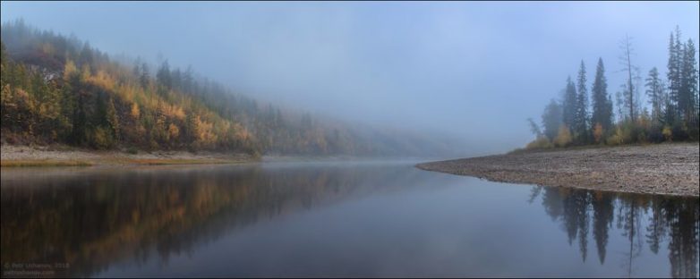 Утром туман плотно укрыл реку. Вообще, начиная с этой стоянки дальше сценарий был всегда одинаковый: ясный солнечный вечер и туманное утром. При этом туман долго не расходился, постепенно поднимаясь и заволакивая небо. Мы даже сначала подумали, что наступила пасмурная погода. Но где-то к часу дня туман исчезал и снова появлялось теплое солнце. Да, днем было до 20-25 градусов на солнце. Мы даже решили несколько раз искупаться))