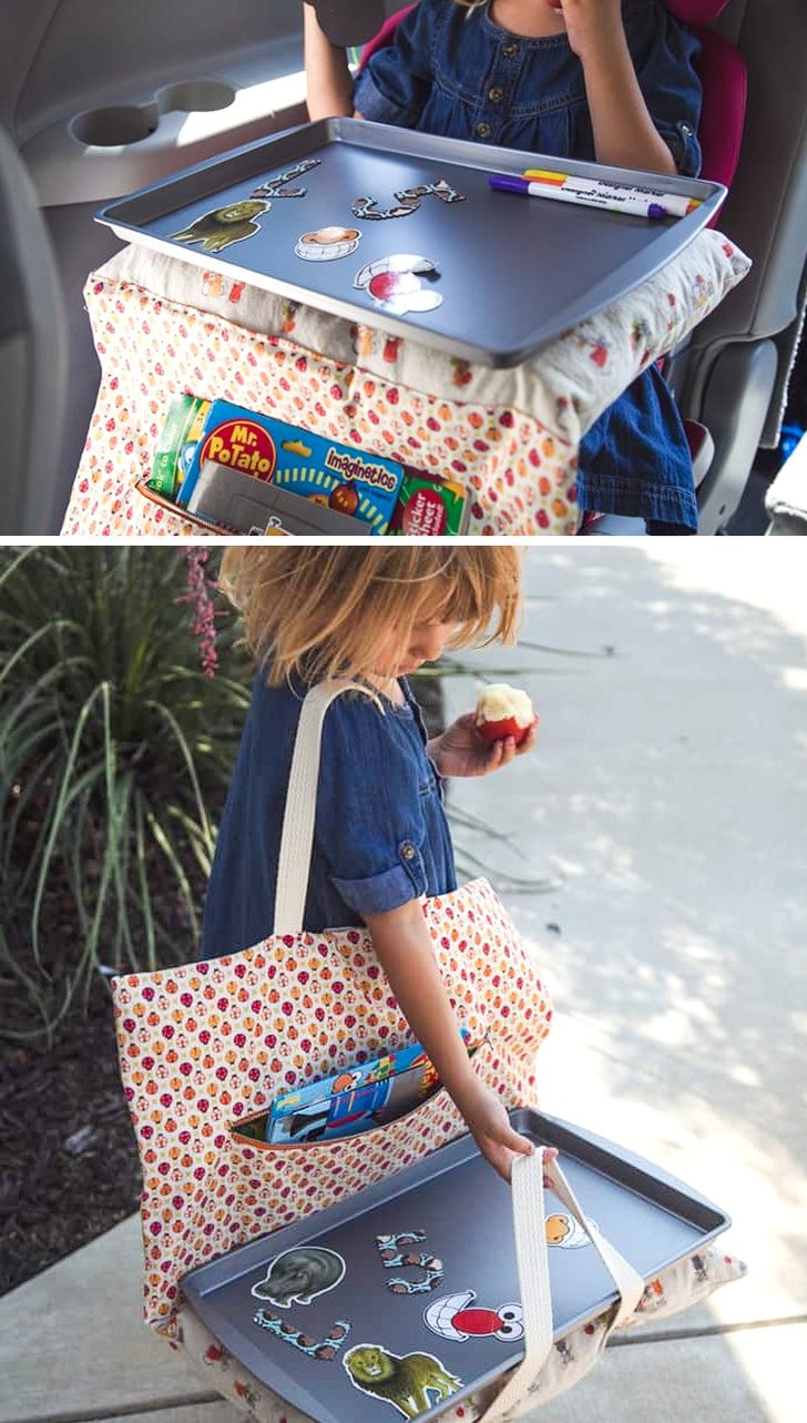 Замечательная идея для мам-рукодельниц — сумка-поднос с подушкой и карманом для хранения детских сокровищ. На таком подносе малышу будет удобно и есть, и рисовать, и играть. А в сложенном состоянии на подушке можно и вздремнуть.