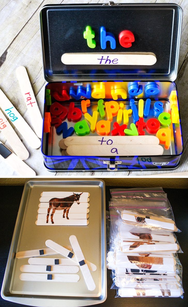 Увлечь ребенка в дороге поможет простая игра «Составь слова», для нее отлично подойдет набор — алфавит для магнитных досок. А слова вы можете написать сами в зависимости от возраста ребенка. Для самых маленьких есть вариация этой игры с картинками, когда нужно составить целое изображение из кусочков. Также можно использовать любимый пазл, приклеив на него маленькие магниты.