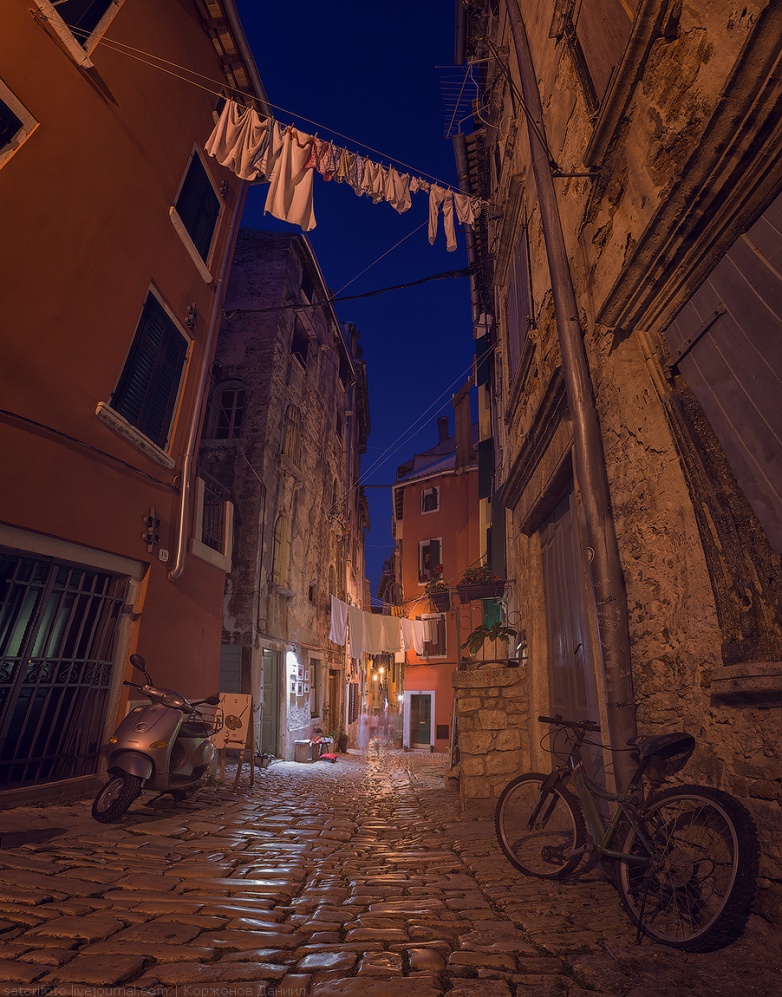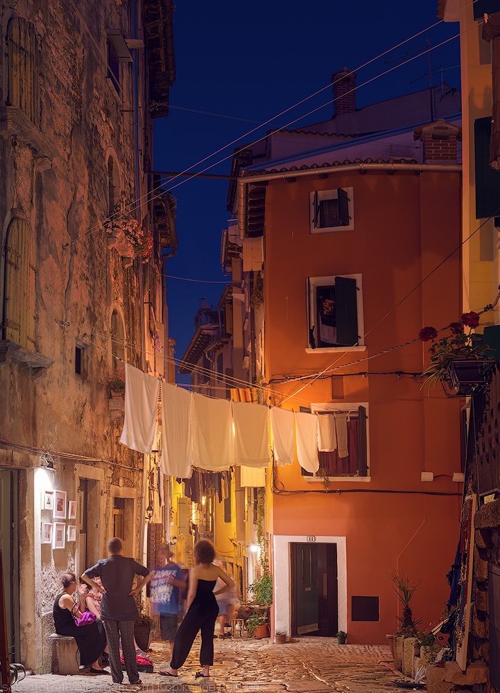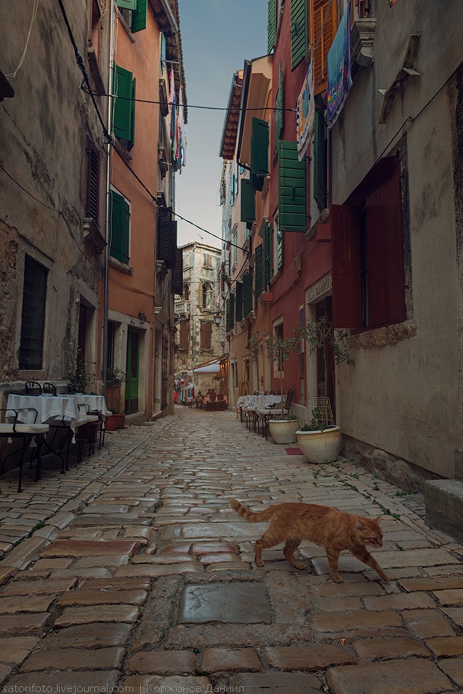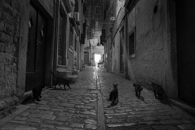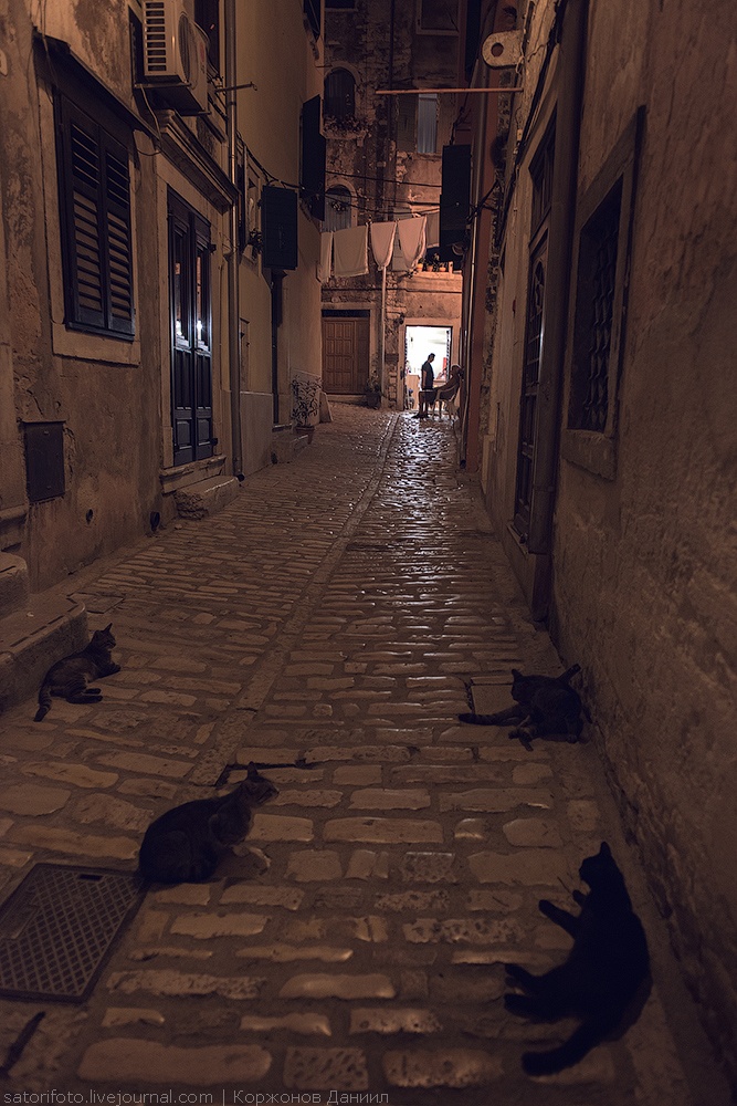 Во второй половине июня я вернулся из небольшого путешествия по Хорватии, где я снимал свадьбу. Удалось потратить 2 дня на Плитвицкие озёра, и один вечер на Ровинь. Это магический город, тёплый, домашний и ярко манящий человека отворить ворота и сделать шаг навстречу маленькому чуду. Предлагаю вам сегодня пройтись со мной по старым мостовым, поглазеть на небо, мостовые и свет, разлитый от ночных фонарей мягким жёлтым светом. А ещё – на местных обитателей, которые котонтролируют весь город.