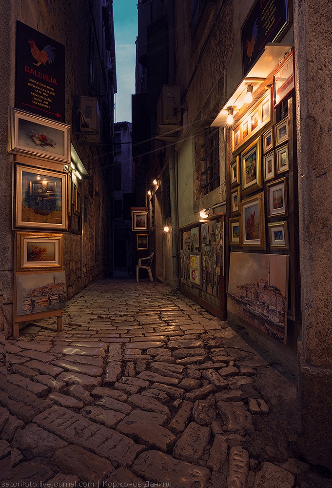 На этот дворик я забрёл совершенно случайно. В Ровине есть очень интересная улица, Grisia. На ней местные художники выставляют свои произведения искусства. Есть много галерей и красивые картины за баснословные деньги.
