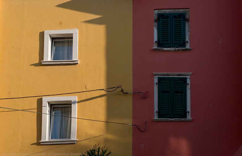 Отдельная история — про ставни города. В Хорватии много внимания обращаешь на окна, на ставни: в каждом городе у них свой стиль. Сейчас много и бездушных пластиковых окон, но сохраняются и совсем старые, заросшие уже цветами.