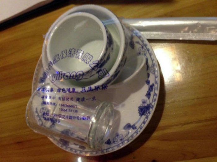 Во многих заведениях Китая вместо сервированного по правилам стола вам могут принести комплект посуды, упакованный в полиэтиленовый пакет. Это выглядит очень гигиенично и вместе с тем странно, ведь китайцев сложно назвать щепетильными и аккуратными. Еще более странным выглядит то, что получив такой пакет, коренные жители промывают посуду водой, которую также приносят официанты.
