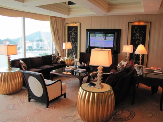 Номер вполне доступный по цене – полторы тысячи патаков за ночь, это 150 евро. В соседней башне отеля – роскошные апартаменты со множеством комнат и дворцовой мебелью – они уже на порядок дороже. Вообще отели Макао соревнуются между собой – кто сможет предложить услуги более высокого класса для состоятельного путешественника. Например, в другом отеле вас ждет отдельный сервис для вип-персон: роллс-ройс, вертолет, услуги дворецкого 24 часа в сутки. И номер, который называется Скай-сьют.