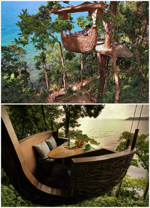 Этот ресторан станет настоящей находкой для любителей романтики. Фишка заведения в том, что в нем нет привычных залов, столов и стульев. Вместо традиционной планировки и мебели — сеть бамбуковых капсул, подвешенных на уровне пяти метров над землей. Внутри каждой — все необходимое для трапезы в узком кругу. В придачу вы получаете возможность наслаждаться потрясающим видом и нетронутой природой.