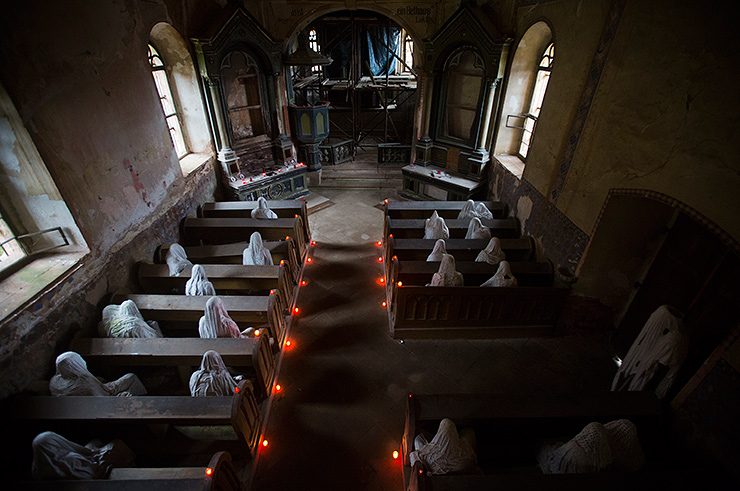Теперь это место — дом для 30 приведений-скульптур, которые создал чешский художник Якуб Хадрава. Призраки сидят на скамейках, стоят в проходе и напоминают священников, слушающих мессу или совершающих молитву. Атмосфера в костеле по‑настоящему пугающая и мистическая.