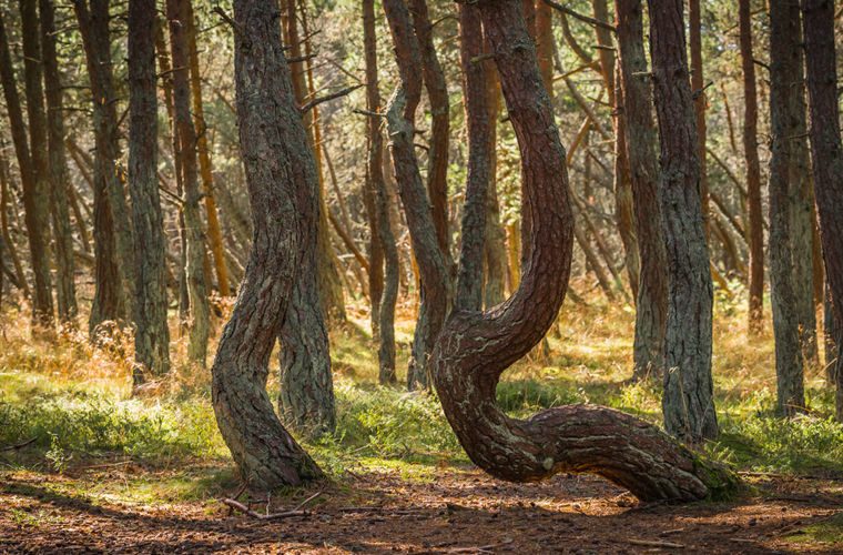 На 37-м км Куршской косы желающие могут поплясать с соснами. «Партнеры» выгибаются дугой, выкручиваются спиралью, сворачиваются в кольца — как змеи какие-нибудь, а не деревья. Не хватает только музыки. Но сопровождает этот залихватский танец абсолютная, звенящая тишина — на этом участке леса даже птицы не поют. Когда в 1961 году на склонах Круглой дюны высадили лес, предназначение у него было самое прозаическое — укрепить песок. Но деревья повели себя своевольно. Версий у возникновения феномена, как обычно, предостаточно. Среди них природные факторы, представляющие собой уникальное сочетание ветров, перепадов температур и особенностей почвы. Винят в аномалии гусениц, охочих до соснового молодняка почему-то именно на этом участке леса. Не обошлось и без «теории заговора» — мол, это все немцы нахимичили.
