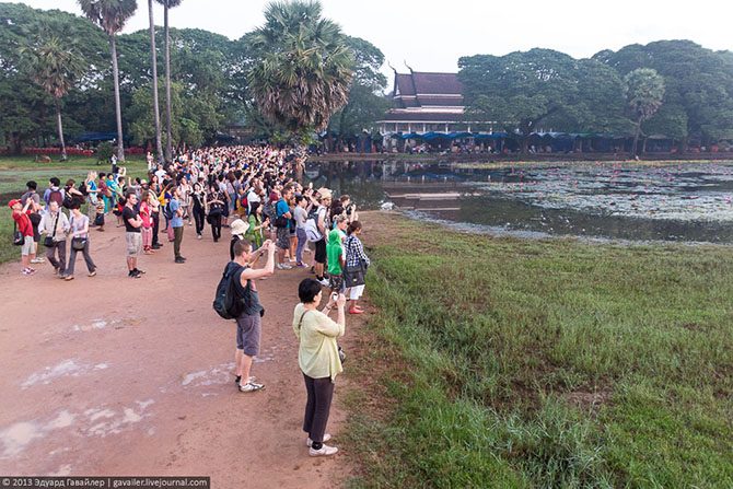 Толпы туристов приезжают сюда в 5-6 часов утра, чтобы увидеть чудо — первые лучи восходящего солнца над Ангкор-Ватом. Этот магический момент-ритуал запечатлевают отсюда: