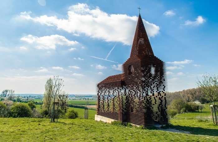 Два молодых бельгийских архитектора Петерьян Гийс и Арноут ван Ваеренберг смогли создать уникальное здание, которое выглядит почти прозрачным. Оно полностью состоит из металлических пластин и скрепляющих их перемычек. При небольших размерах вес здания составляет 30 тонн. Несмотря на это, силуэт классической немецкой церкви, кажется, парит в воздухе. Находится необычный архитектурный объект в очень живописном месте, добраться до которого можно только пешком – это еще одна задумка его создателей. Игра света и первозданная природа создают у посетителей церкви особый настрой и рождают множество мыслей о душе, вере, человеке и его месте в этом мире.