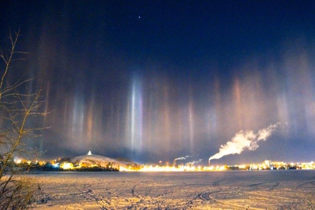 Довольно необычное явление наблюдали жители Нижнего Тагила, где в небе зажглось «северное сияние». Подобное природное явление ученые связывают с погодой, ведь из-за мороза капли воды в воздухе превратились в кристаллы льда и начали преломлять свет, исходящий от города.