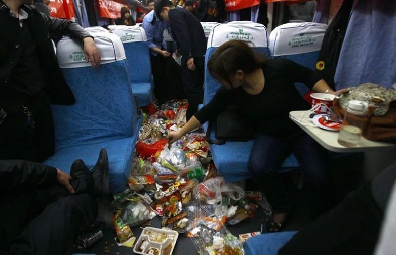 Накануне праздников большая часть обычного люда начинают ездить из одного района страны в другой. В этой миграции участвуют обычные рабочие, и они превращают вагоны поездов в настоящую свалку.