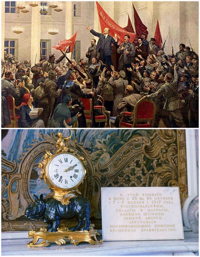 В Малой столовой Зимнего дворца хранятся старинные часы. Согласно легенде, они остановились 26 октября 1917 года. В тот самый момент, когда было свергнуто временное правительство, а вместе с тем пришел конец буржуазному строю. На самом деле часы были остановлены человеческими руками и никакой мистики в этой ситуации не было. Остановка часов ознаменовала конец буржуазной эпохи. Примечательно и то, что на 100-летний юбилей Октябрьской революции часы завели снова.