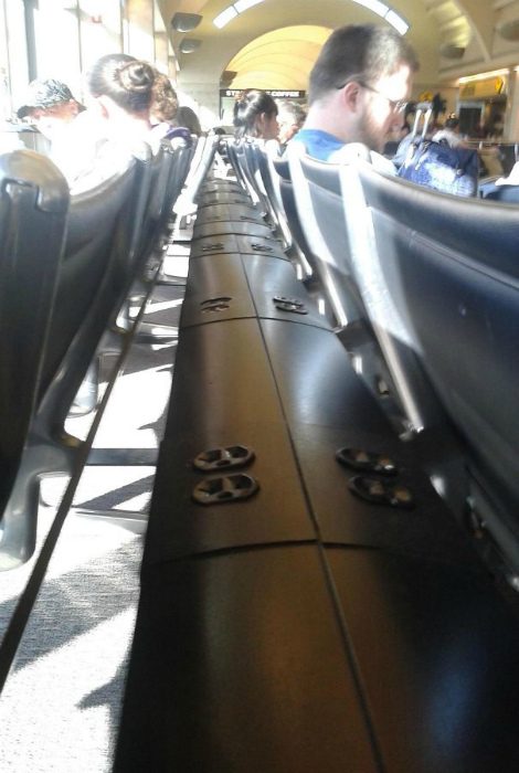 В большинстве аэропортов ощущается огромная нехватка розеток, а те, что есть, чаще всего располагаются низко. Из-за этого людям, которым нужно поработать, приходится сидеть на полу. Решение проблемы предельно просто, нужно просто разместить розетки за стульями.