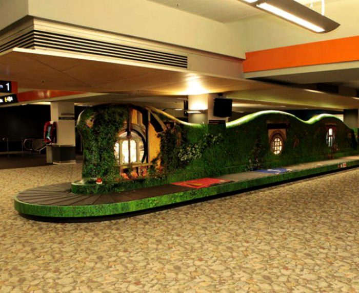 В аэропорту Веллингтона в Новой Зеландии багаж можно получить на живописной карусели с зеленой стеной. Подобное решение прекрасно соответствует духу, утопающего в сочной зелени, Веллингтона.