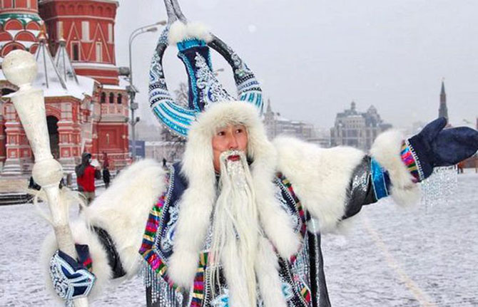 Ямал Ири. В Монголии Дед Мороз похож на пастуха. Он одет в мохнатую шубу и большую лисью шапку. На боку у него табакерка, кремень и огниво, а в руках — длинный кнут.