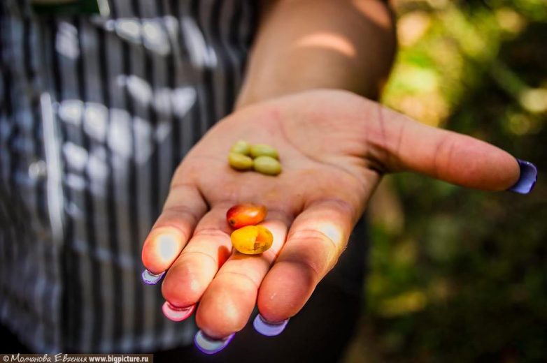 Кофейные ягоды созревают не одновременно, а собирать нужно только те, которые уже покраснели. Поэтому по одному и тому же склону сборщики проходятся несколько раз в месяц.