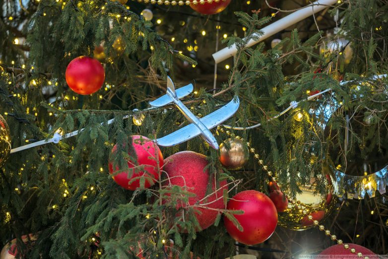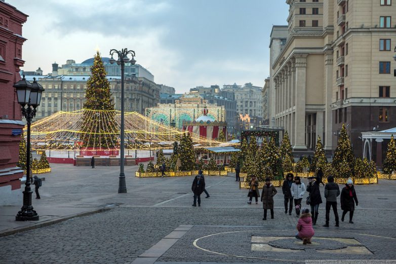 На Манежной всё густо усыпано ёлками и огнями.