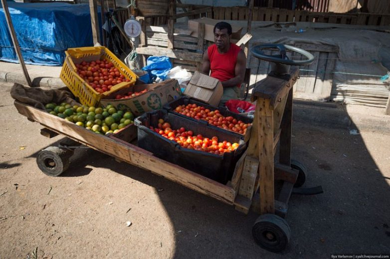 Знаменитая ямайская тележка. Тут все с такими. Обязательно автомобильный руль, Он через веревки управляет передними колесами. Сзади справа есть тормоз — сделан из куска старой покрышки. Колесики тоже самодельные — полоски резины прибиты гвоздями к деревянной болванке. Такие тележки есть у каждого торговца.