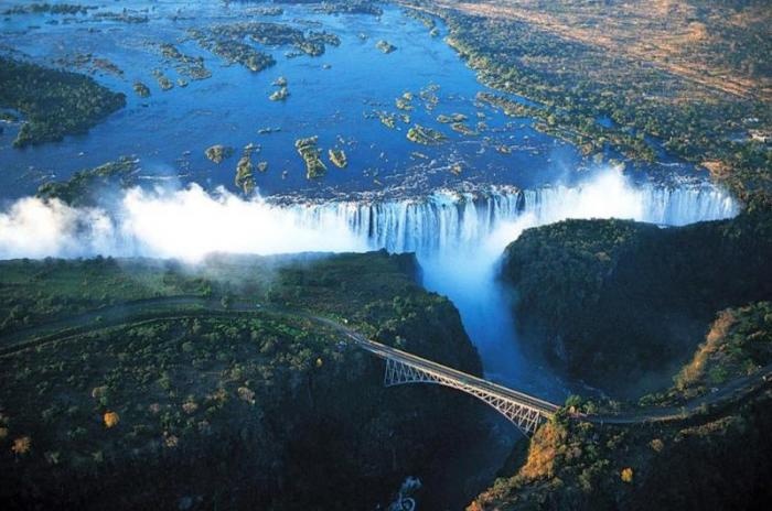 На границе между двумя африканскими странами, Замбией и Зимбабве, расположилось уникальное чудо света и одна из самых посещаемых достопримечательностей Африканского континента. Река Замбези низвергается на сотню метров вниз с огромного базальтового утеса шириной почти в два километра, образуя один из самых мощных водопадов на планете – водопад Виктория. В полной мере прочувствовать грандиозность и живописность этого невероятного потока воды удастся только во время экскурсии на вертолете. Поднявшись в небо, вы замрете от восхищения — в половодье с утеса ежеминутно с грохотом срываются вниз более пятисот миллионов литров воды, образуя туман, видимый за пятьдесят километров. Не зря туземцы называли это грандиозное творение природы Гремящим дымом. А нынешнее имя водопаду дал первый европеец, посетивший это потрясающей красоты место в 1855 году – Дэвид Ливингстон, чей памятник сейчас украшает левый берег реки Замбези. «Крылатые ангелы остановились бы в полете, чтобы полюбоваться этим зрелищем», — воскликнул потрясенный Ливингстон. C тех пор ничего не изменилось – так же думают сейчас миллионы туристов, посещающие водопад Виктория.