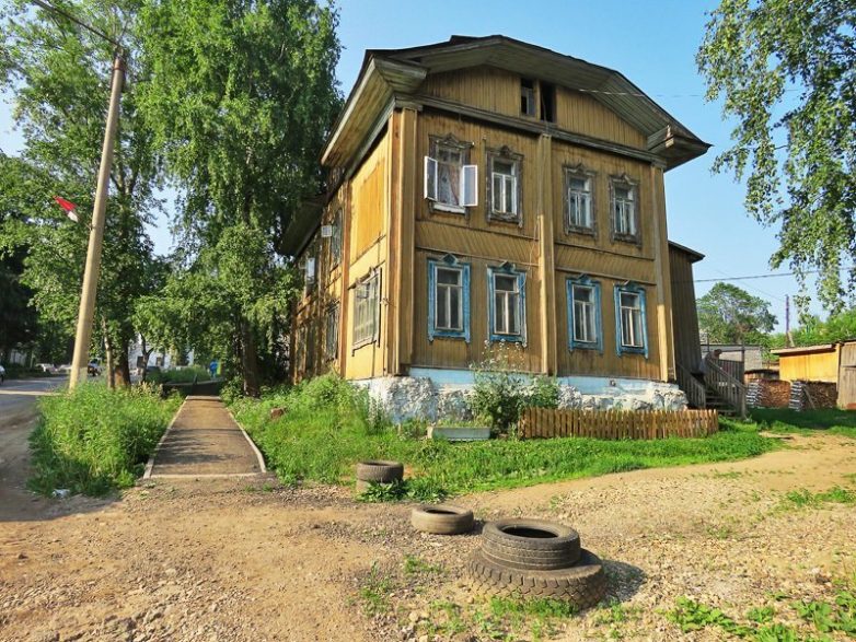 С другой стороны площади к Иньве спускается улица Лихачёва — в данном случае Михаила Лихачёва, коми-пермяцкого писателя, расстрелянного в 1937-м. На ней, торцом к «Сказанию о Кудым-Оше» стоит пожалуй самая монументальная в Кудымкаре сталинка — бывшая контора «Комипермлес» (1959). Единственным богатством Комиокруга была парма, то есть по-нашему говоря — тайга, и советская власть развивала его как регион одной отрасли — лесозаготовок. Их рентабельность при местном бездорожье держалась в первую очередь на молевом сплаве по рекам, а вот он-то в 1995 году и был запрещён. В первую очередь — по экологическим причинам: часть брёвен тонула и гнила на дне, отравляя реки, и даже Каме понадобилось ещё десятилетие, чтобы в очистившейся воде, например, появились раки. А вот людям пришлось куда хуже — частные лесхозы, на которые был разделён «Комипермлес», по большей части «не вписались в рынок», и распад лесного комплекса сделал КПАО беднейшим регионом всей России… Лесоконтору ныне занимает мэрия, и соотнося грустные цифры здешней экономики с жизнерадостным видом Кудымкара, к ней проникаешься уважением: