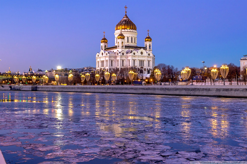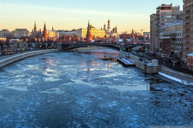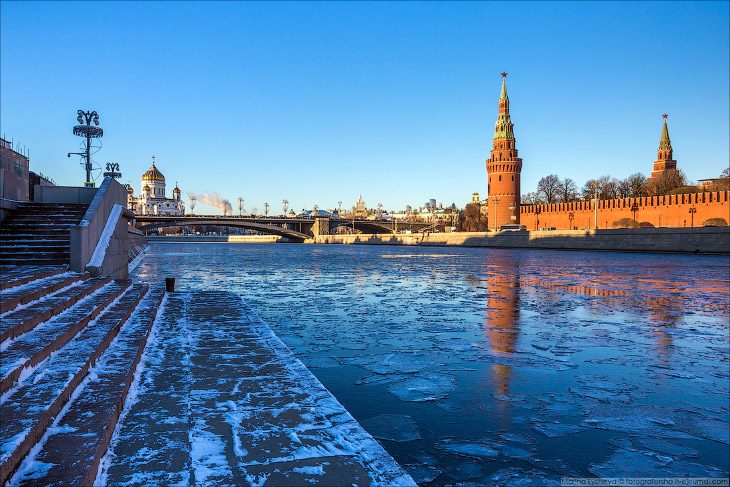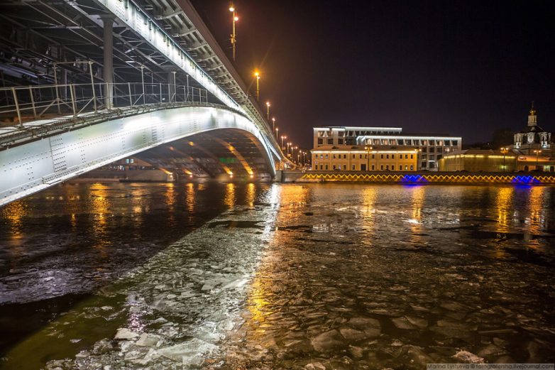 Около Болотной набережной лёд гладкий, движение Водообводного канала тут не сильное, поэтому застыло ровно и красиво.