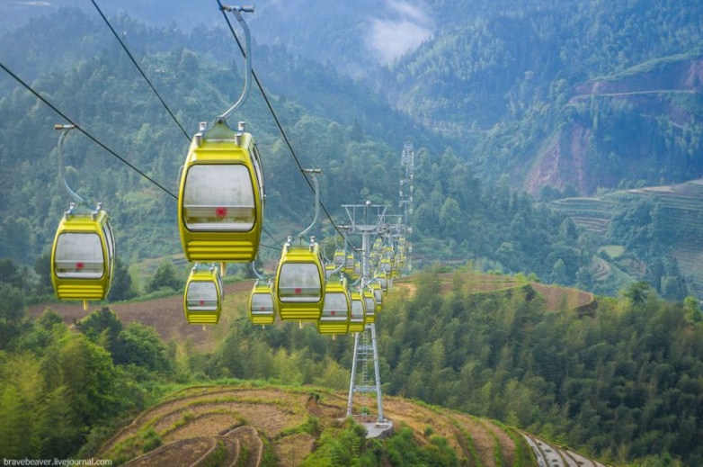 До одной такой деревни мы добрались часа за три. От нее уходила дорога, которая вскоре, как мы считали, должна была вывести нас к станции канатки ниже от нашего отеля. Но тут мы крепко промахнулись. Дорога была горной и петляла по склонам холмов. И вместо 1,5 км как мы считали, нам пришлось пройти 7. Жара стояла невероятная. На террасах, где везде вода, она почти не ощущалась, а вот на раскаленном асфальте, где совершенно нет тени, идти по такой дороге было не просто тяжело, а и опасно. На середине пути от страшной жары у меня начала кружиться голова, да и Леша чувствовал себя не намного лучше. В итоге мы дошли до поста полиции, километра за 1,5 до канатки, где попросили довезти нас попутную машину обратно к нашей деревне. Наверх мы поднимались на канатке, не рискнув в такую жару идти пешком наверх. Забрав вещи и Хао, мы спустились снова вниз, к автобусной станции. Нам предстояло добраться сегодня до последней точки нашего путешествия – в Яншо.