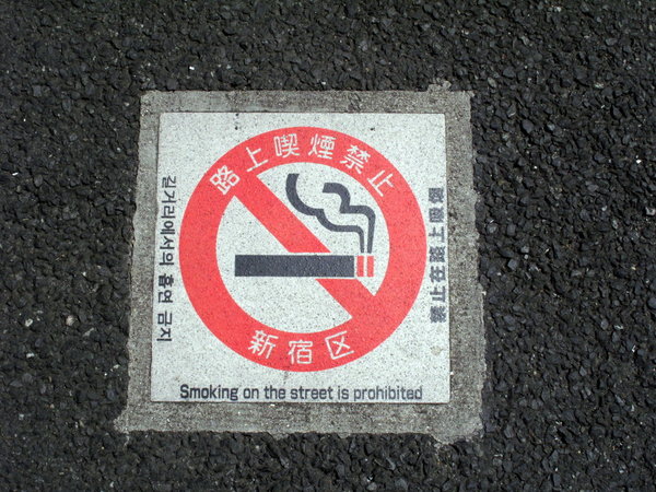 Здесь нельзя курить на улице. Под ногами пешеходов постоянно попадаются надписи, которые об этом напоминают. Иногда на таких знаках есть текст на английском, корейском и китайском.