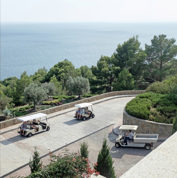 Люди катаются на машинках для гольфа на одном из крымских курортов.