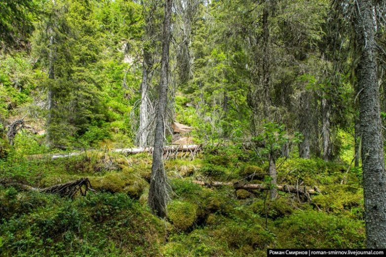 Пожалуй, это был самый жуткий участок маршрута. Нависающие каменные глыбы, на самой тропе какой-то бурелом. Приходилось постоянно перелезать через упавшие стволы деревьев. Казалось, что вот-вот откуда-нибудь выйдет медведь. Медведь не вышел, а мы и рады были этому.
