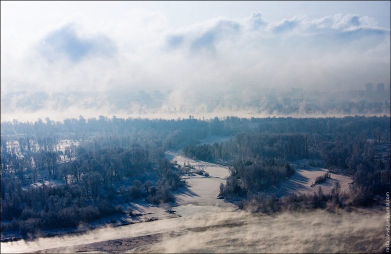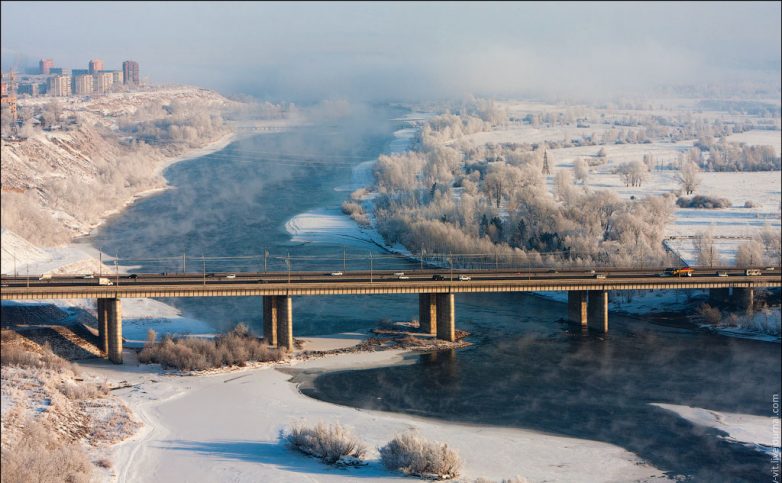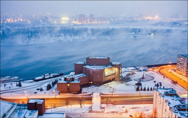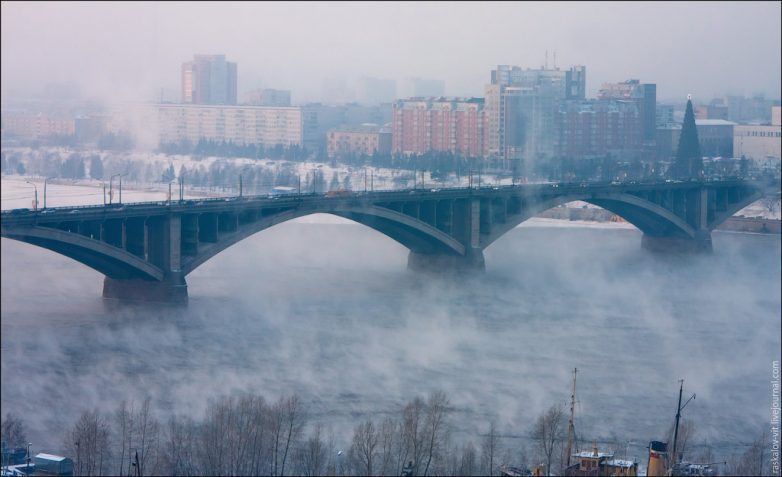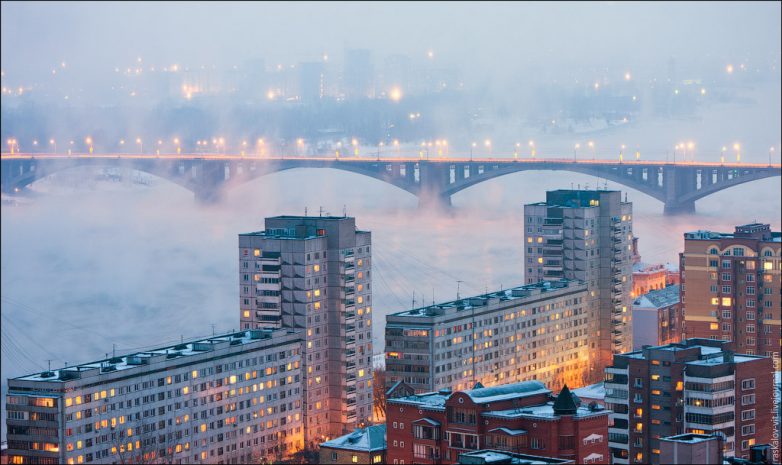 Жилой комплекс «Перья» и парящий туман над Енисеем.