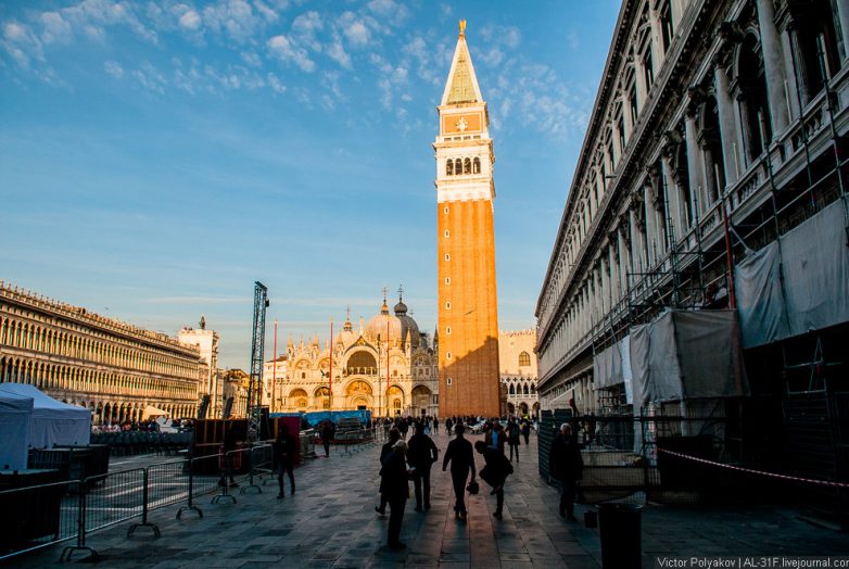 Вечером, когда солнце уже начало клониться к горизонту, а дневная свежесть сменилась вечерней прохладой, я вновь направился на Сан-Марко, где за 8 евро поднялся на колокольню. Говорят, с этой колокольни в начале 17 века за звёздами наблюдал Галилео Галилей, но вы этому не верьте. Нынешняя колокольня построена только сто лет назад, взамен той, с которой Галилей наблюдал за небом, и которая обрушилась в начале 20 века.