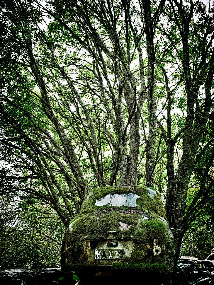 Оставшись один на один с природой, четырехколесные друзья человека обрастают с годами мхами, сквозь них прорастают деревья, на их кузове расцветают цветы. Мистическое зрелище.
