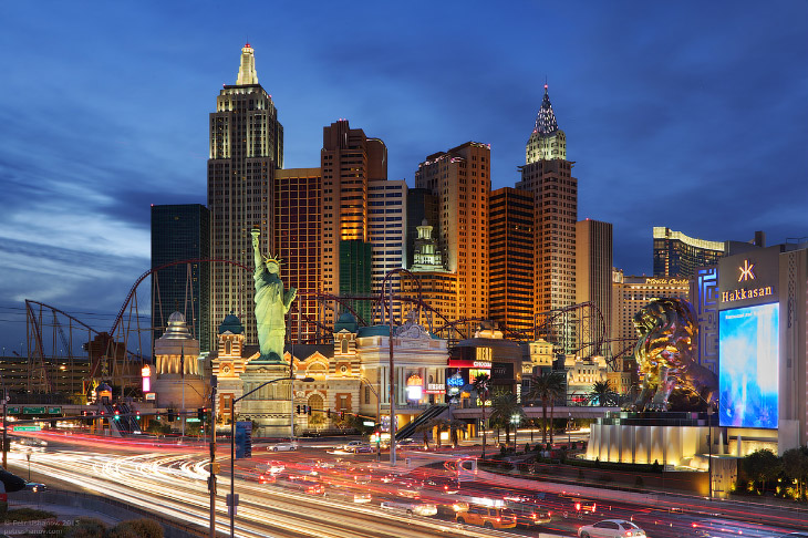 Лас-Вегас Бульвар протянулся с юга на север. Давайте посмотрим, что же на нем стоит. Почти в самой южной его части находится отель Нью-Йорк. Его здание напоминает Манхэттен (это, кстати, все одно здание), а на углу Бульвара и Тропикана-авеню стоит статуя Свободы.