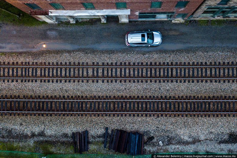 Весь город в одной фотографии. Внутри здания пустые, хотя все входы заколочены и внутрь не попасть. Припаркованные машины принадлежат работникам железной дороги — что-то они там делали, копались.