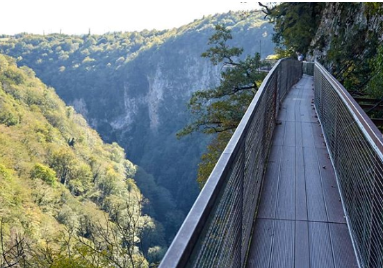 Каньон Окаце — уникальная достопримечательность Имеретии. Здесь вы сможете посмотреть на каньон сверху вниз, так как вдоль скал на высоте 140 м над землей оборудована подвесная пешеходная тропа с мостиками и балконами. Длина тропы чуть менее 1 км.