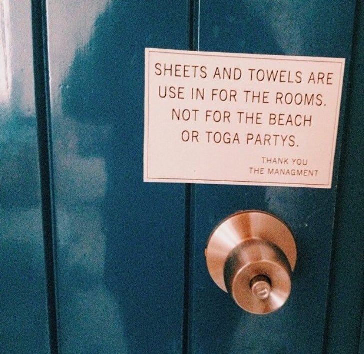 «Простыни и полотенца предназначены для использования в номере. Не на пляже и не на вечеринках в тогах».