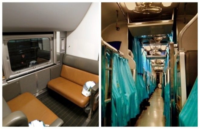 В каждом отдельном купе расположено шесть полок в три яруса, а вместо боковых установлены столики и откидные кресла, где можно пообедать или просто посидеть, наблюдая за сменяющимся пейзажем за окном поезда.