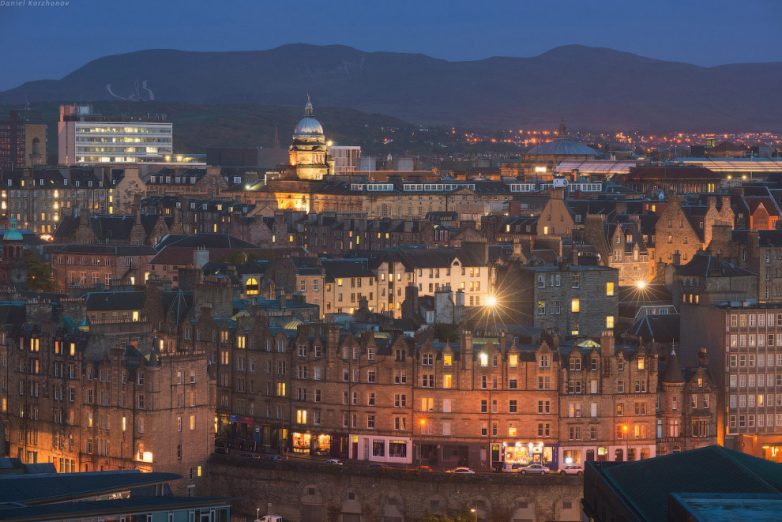 Город очень красив и с точки зрения фотографа: есть несколько чудесных видовых точек, с которых открывается панорама на город. Одна из них — Calton Hill, она на фотографии. Виден вдали замок Эдинбурга, и шпиль (остроконечный, справа от башни с часами) монумента Вальтеру Скотту. На монумент мы тоже забирались — и это того стоит!